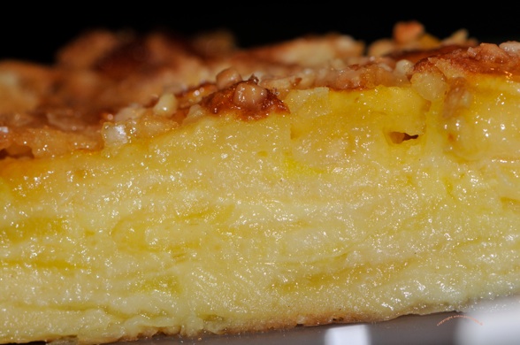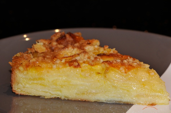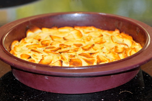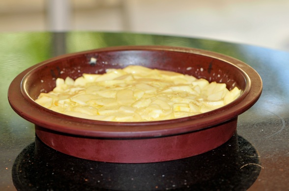 Préchauffer le four à 200°C. Peler et épépiner les pommes. Les couper en très fines lamelles ( ou rondelles en ôtant le coeur de la pomme ) à la mandoline. Les immerger au fur et à mesure dans la pâte afin qu'elles ne s'oxydent pas.