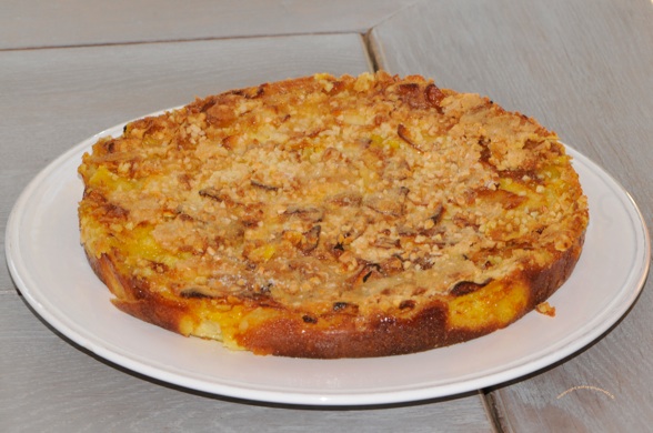 Pendant ce temps, réaliser le croustillant : Battre l'oeuf et le sucre jusqu'à ce que cela blanchisse. Y ajouter le beurre fondu. Verser sur le gâteau chaud, parsemer d'amandes effilées et saupoudrer de la cuillère à soupe restante de sucre.