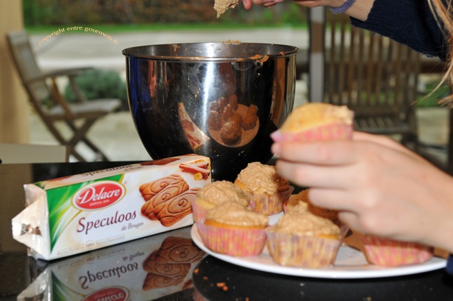 Remplissez les caissettes de la préparation jusqu'au 2/3 et déposer 1 cuillère à café de pâte de spéculoos sur chaque cupcake.