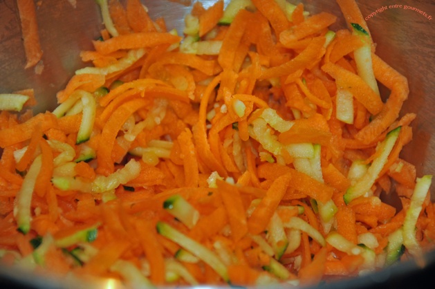 Laver les légumes et les râper à l’aide d’un robot muni d’une râpe à gros trous, chez moi le Kitchenaid;