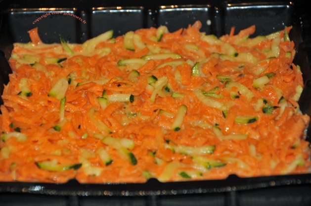 Incorporez les légumes râpés. Salez généreusement et poivrez. Bien mélanger le tout, puis versez dans un moule à manqué beurré ou un moule en silicone (le moule tablette Demarle pour moi) en tassant bien.
