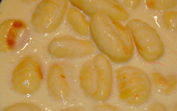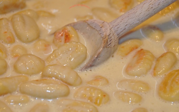 En attendant faites griller les gnocchis dans une poêle avec du beurre; ajoutez la sauce et mettez les épices suivants vos goûts.