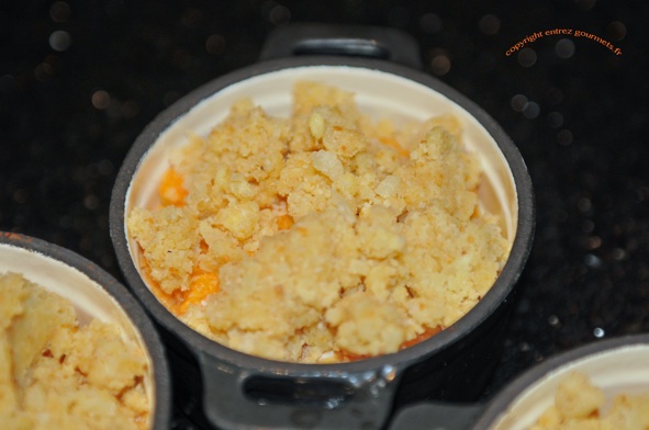 Recouvrez de pâte à crumble au parmesan et enfournez pour 20 minutes en surveillant la cuisson.